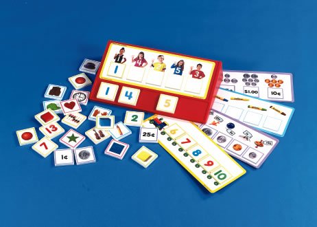 Pre-K & up. Develops beginning math skills including colors, shapes, numbers, counting, sequencing, patterning, and money values. Includes 100 tiles, 50 activity cards, activity guide andtray with storage compartment.